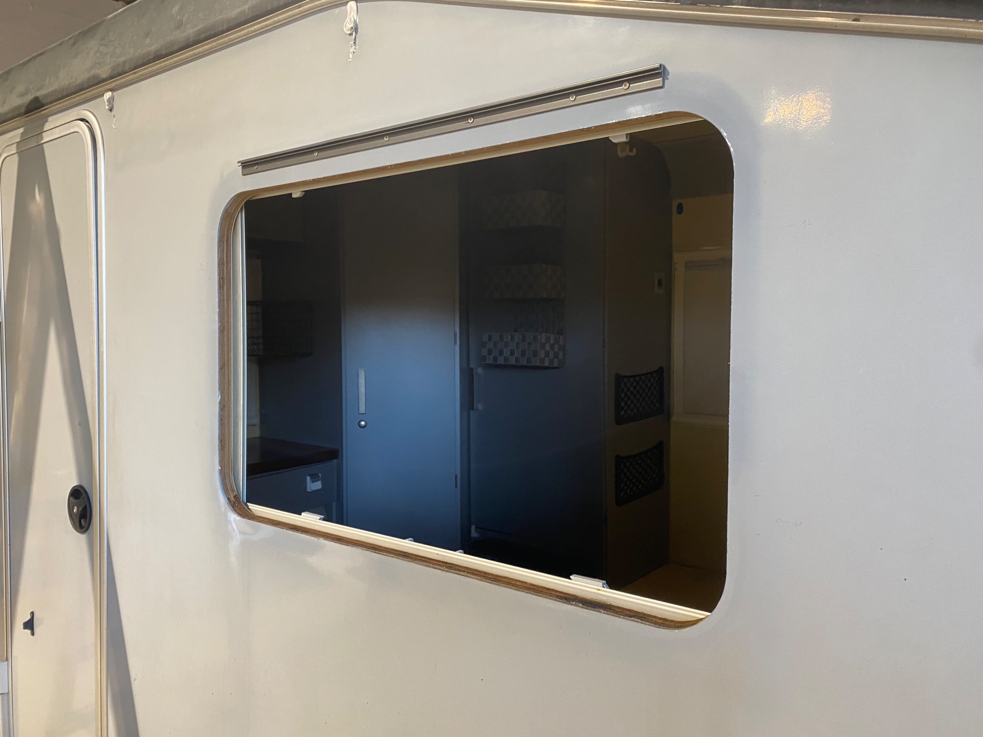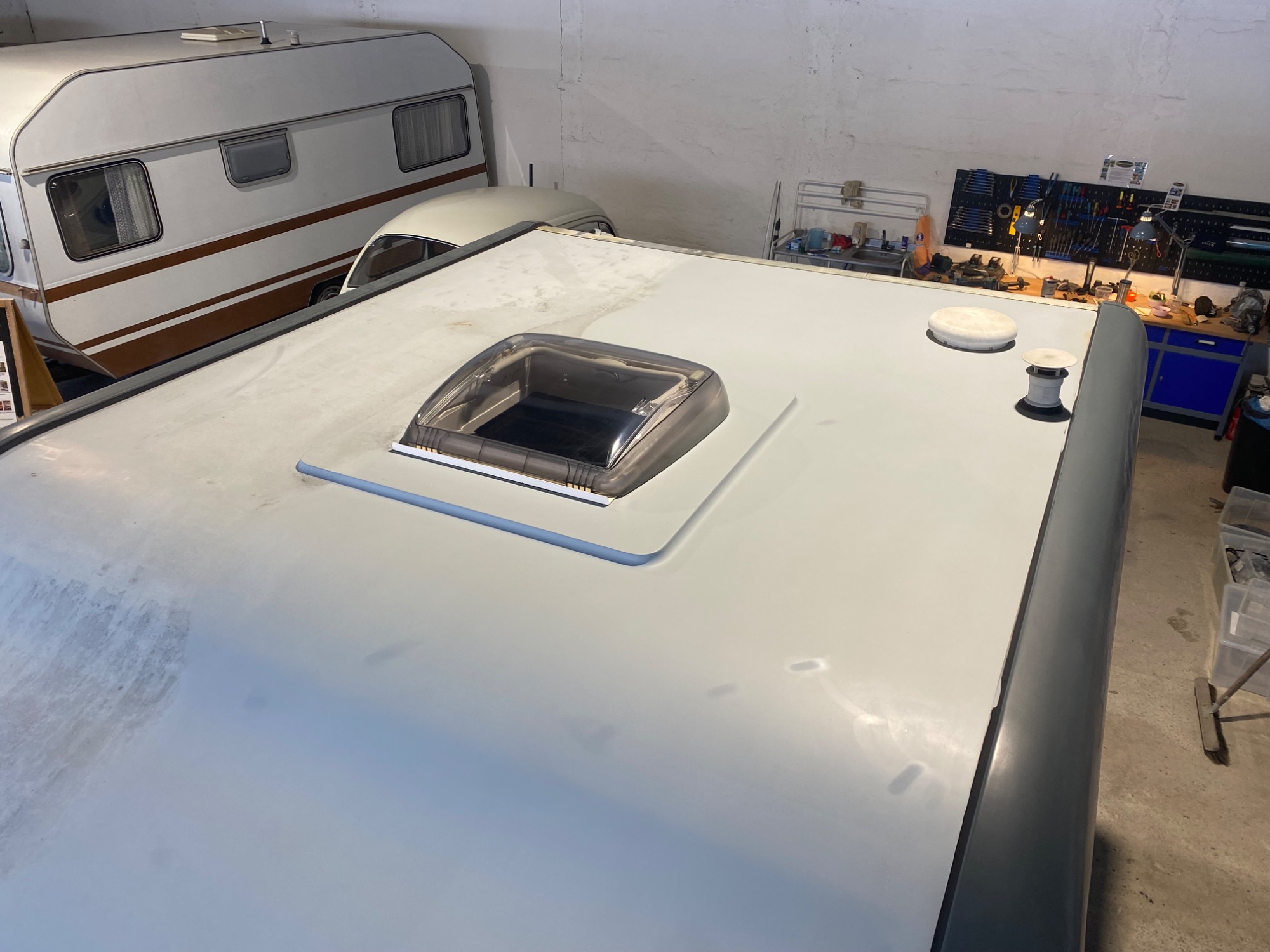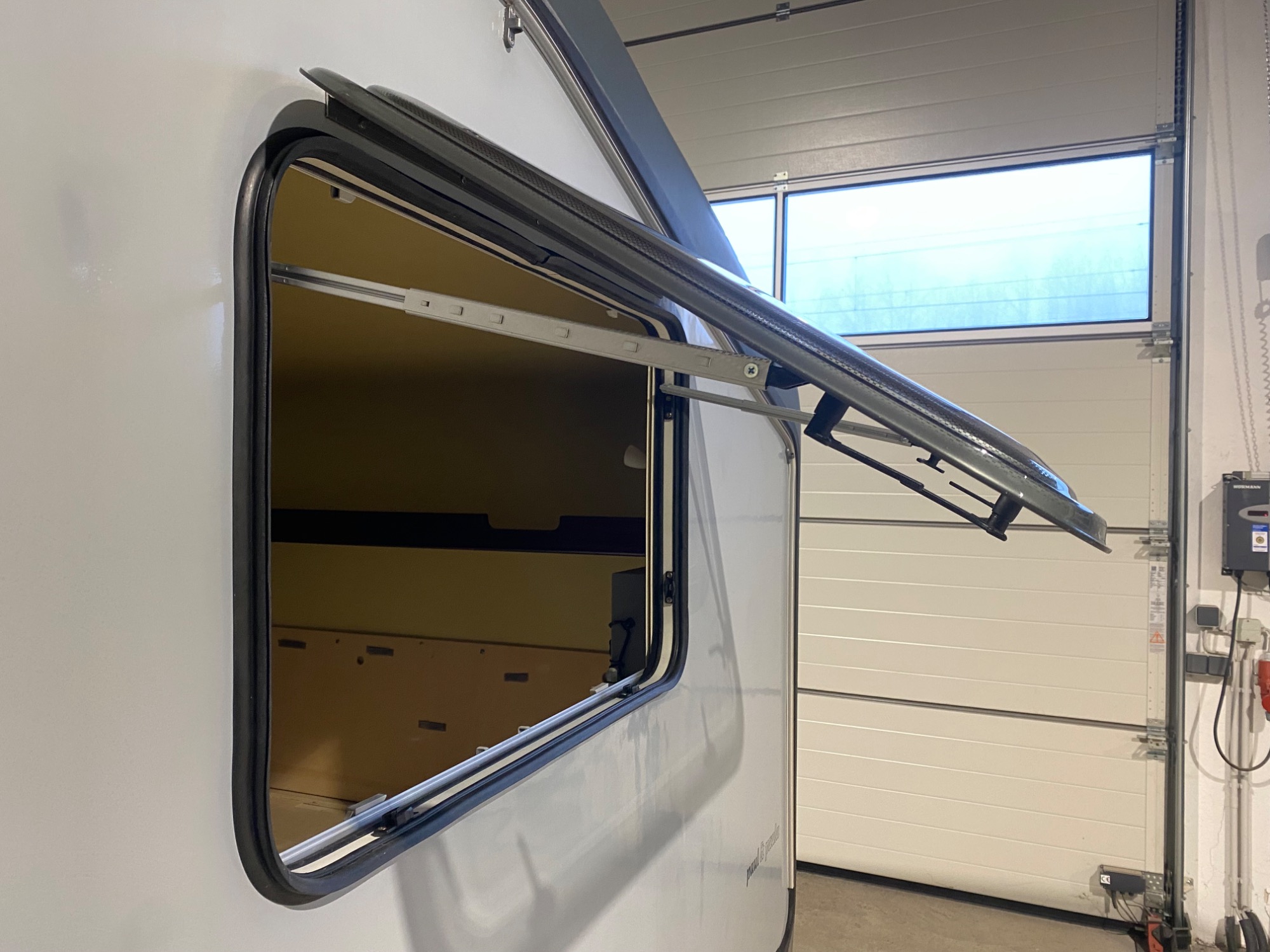 Abdichtung aller Vorzelthaken und der umlaufenden Dichtkante, Neuabdichtung Fenster Türseite, neue Aussteller, Rollo Küche repariert, Grundreinigung Aufbau