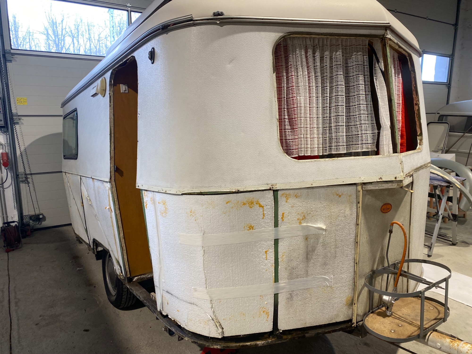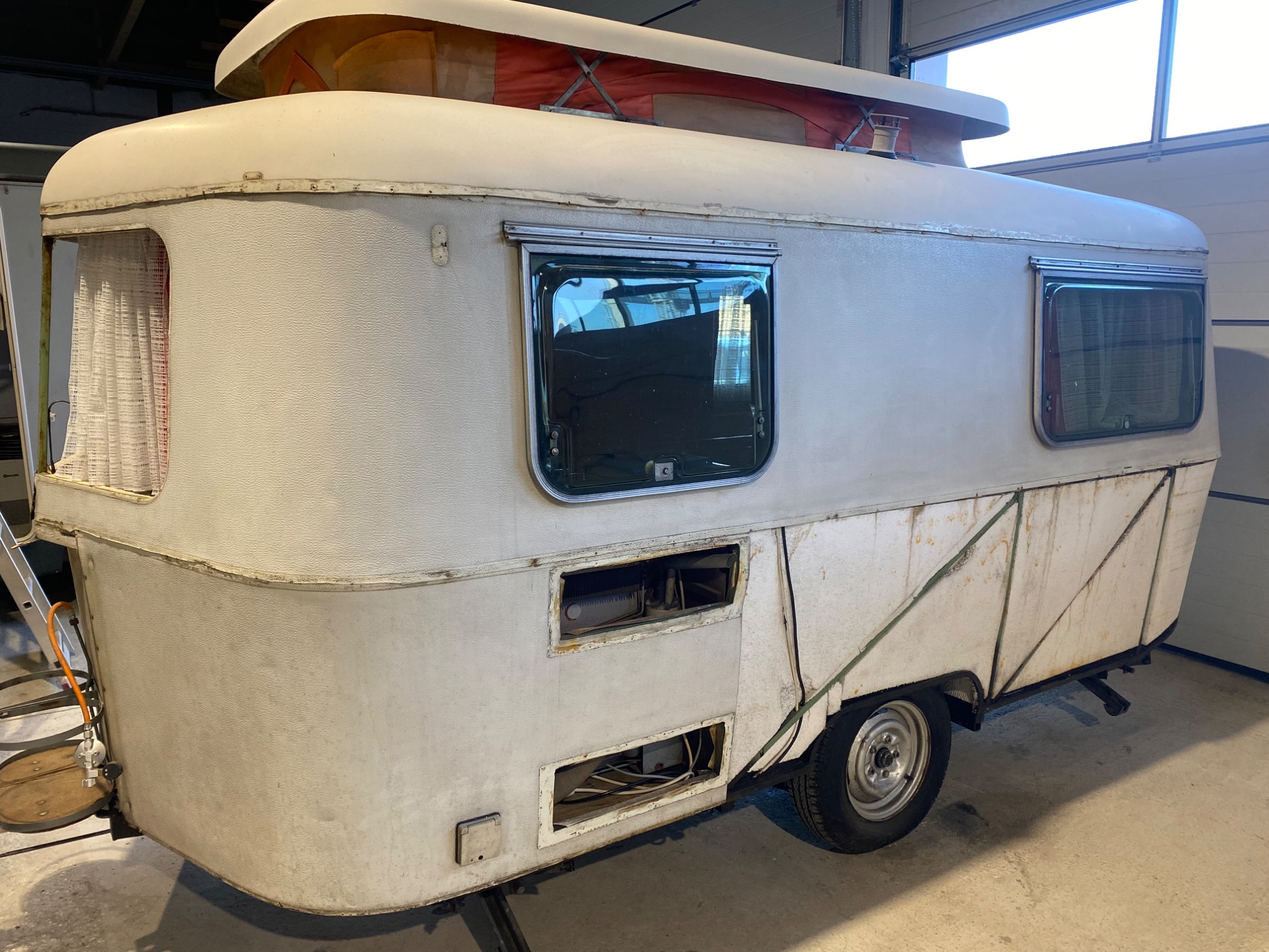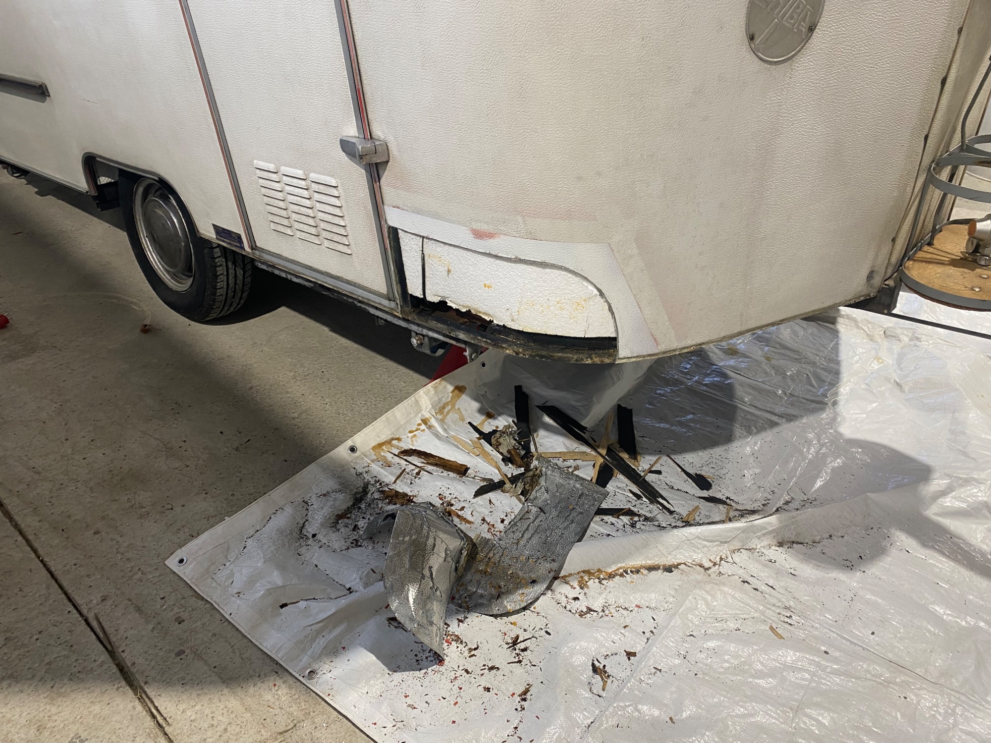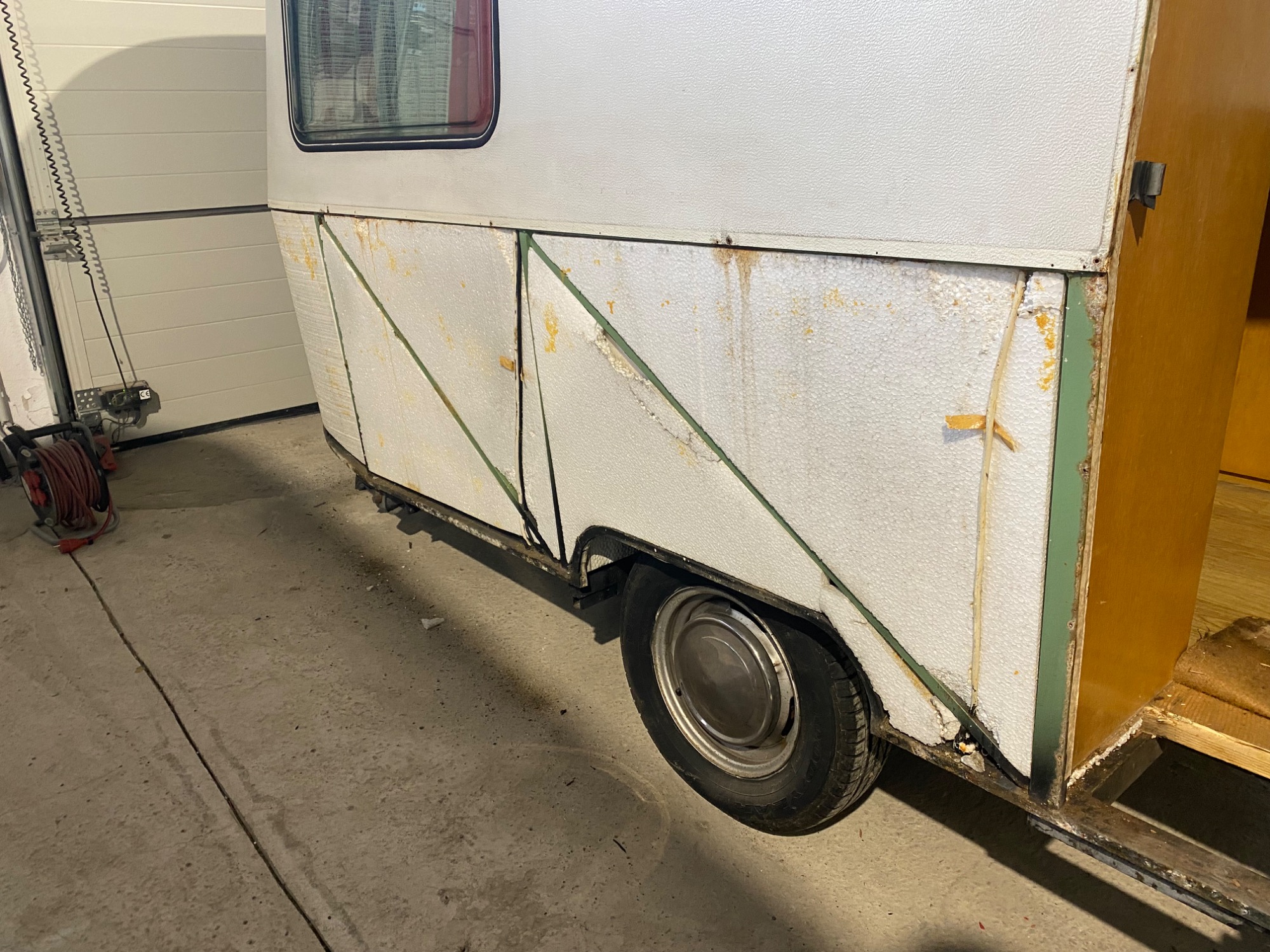 Der Wohnwagen besteht komplett aus Stahlblech, die Schweller rundum rosten durch wie beim Auto ... dieser war gerade noch zu retten, mit umfangreichen Karosseriearbeiten und natürlich dann gründlicher Konservierung - Hohlräume, Bleche innen und aussen und Unterboden.