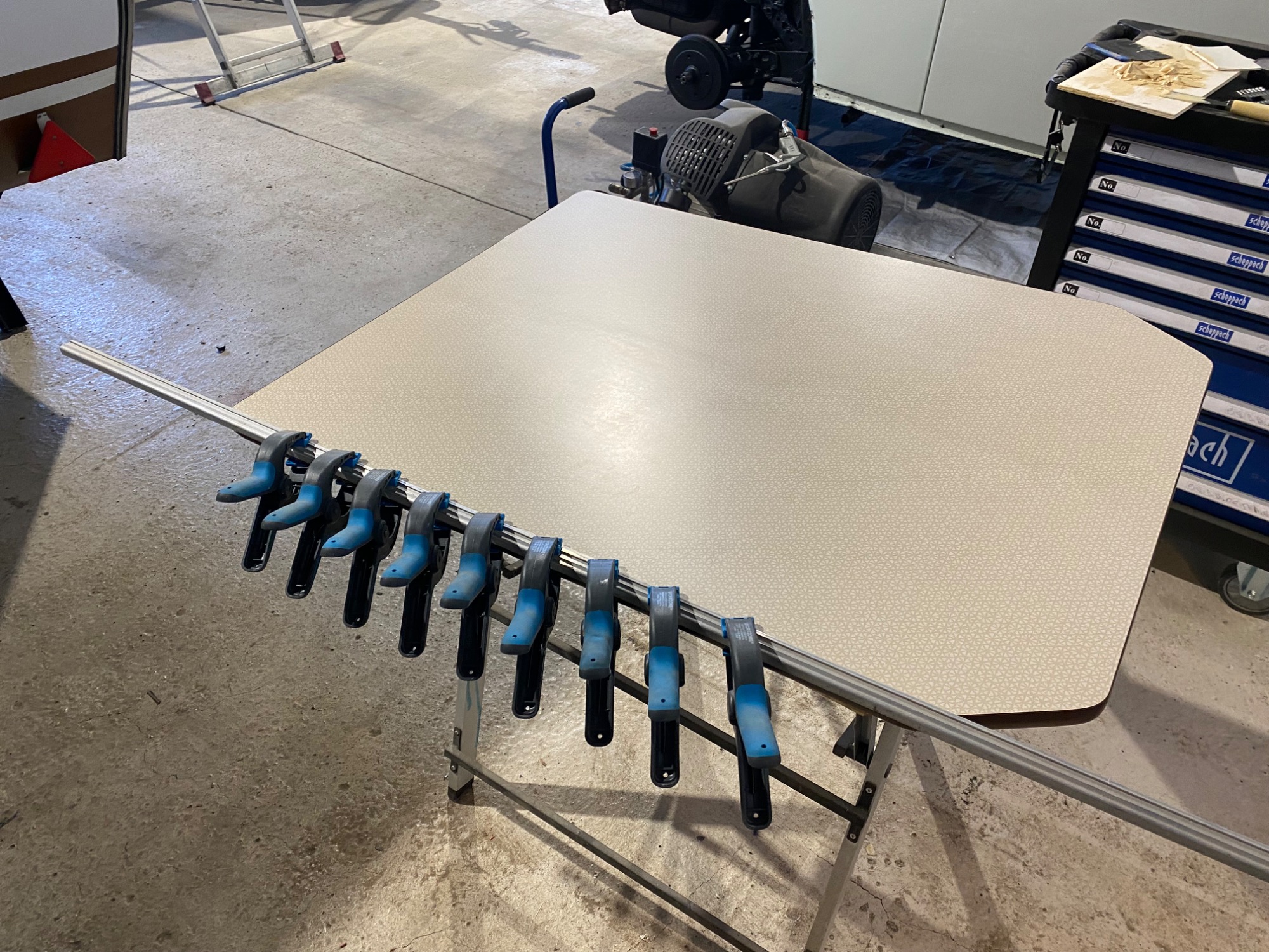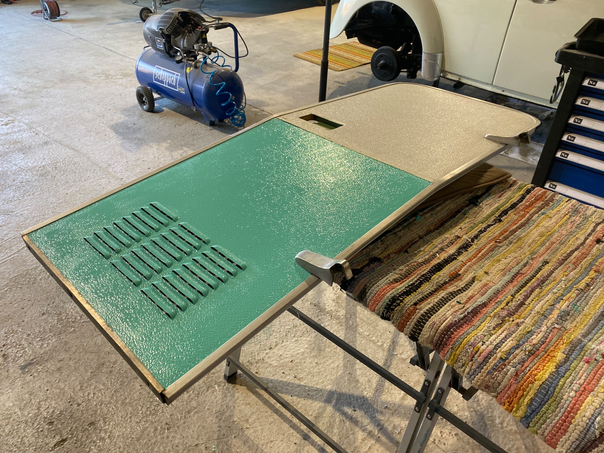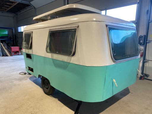 Auftrag für Camping-Classics: Neuabdichtung der Kanten und Lackierung der beiden Seiten in Originallack Perlweiss und Oxidrot ... das Ergebnis hat mir richtig Spass gemacht - ein toller neuer Autritt!