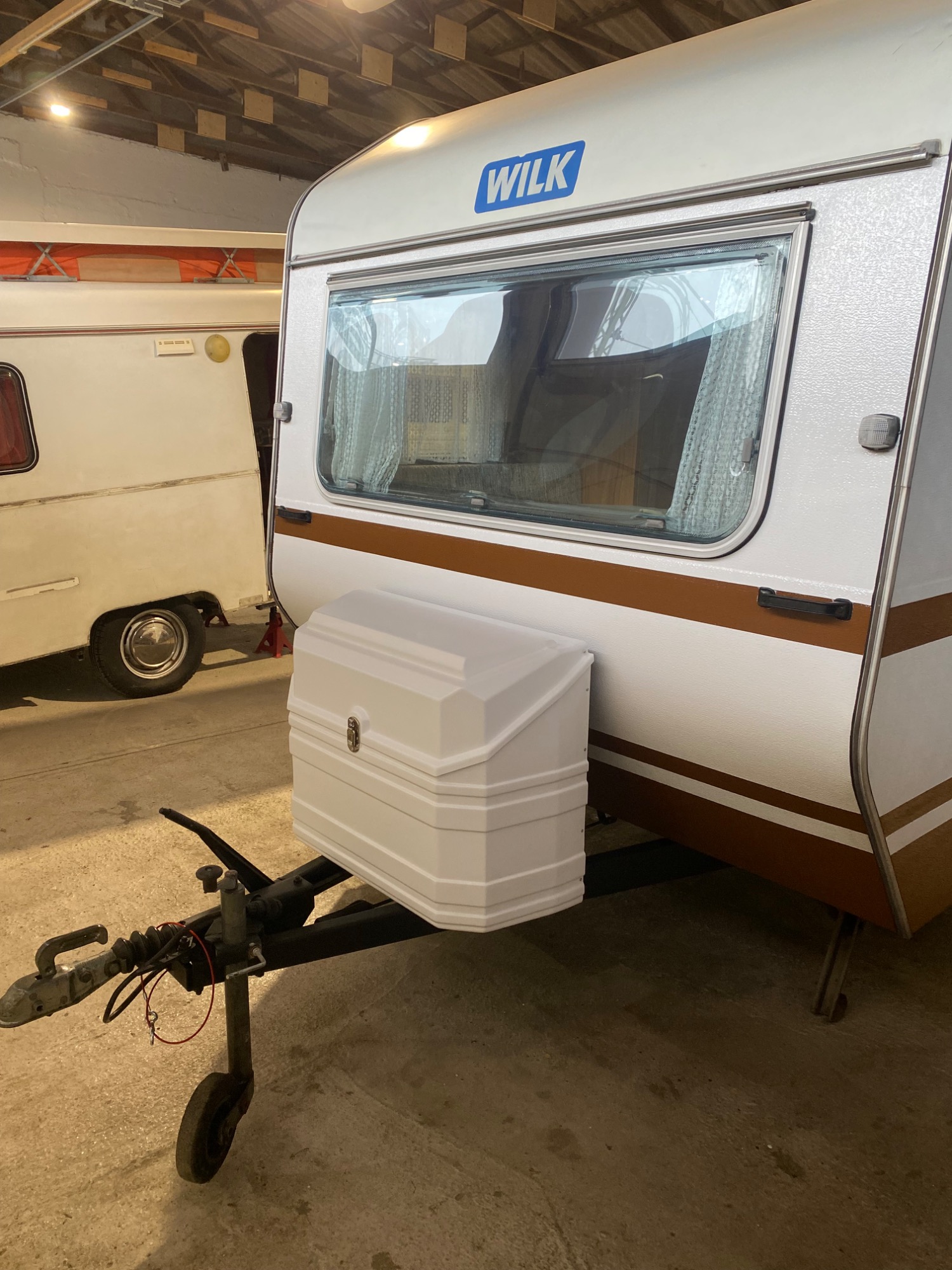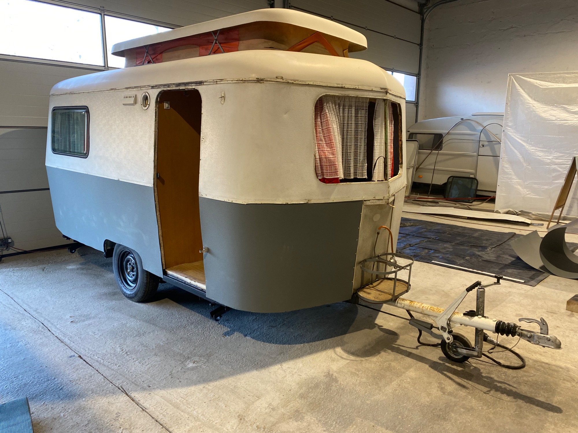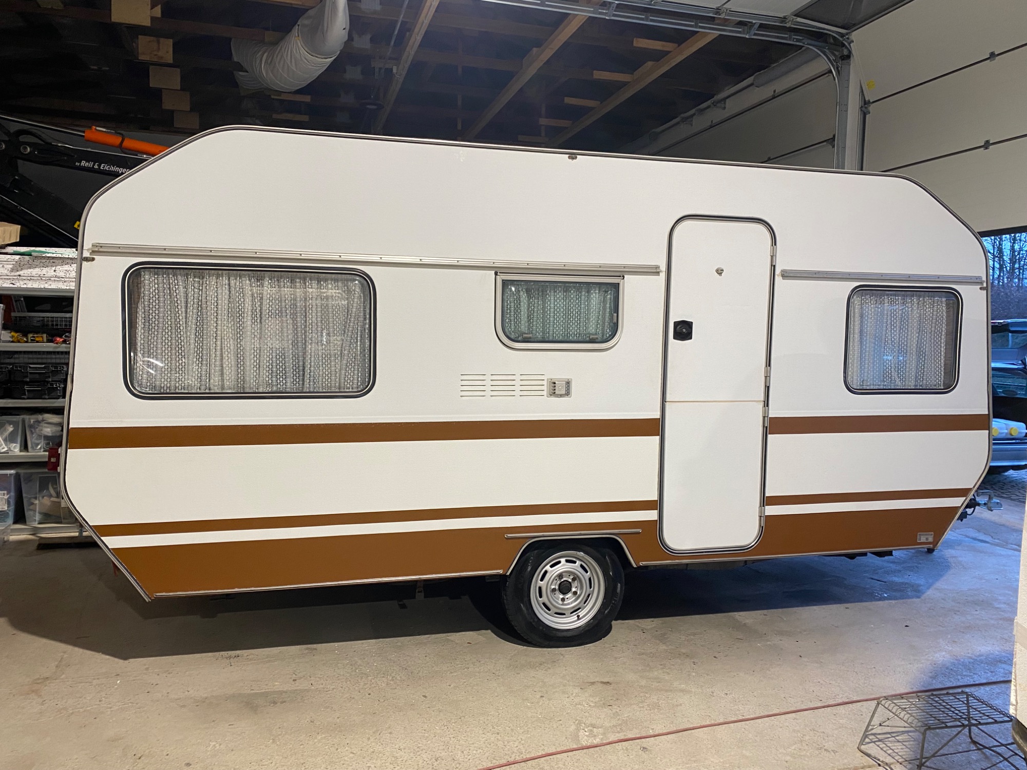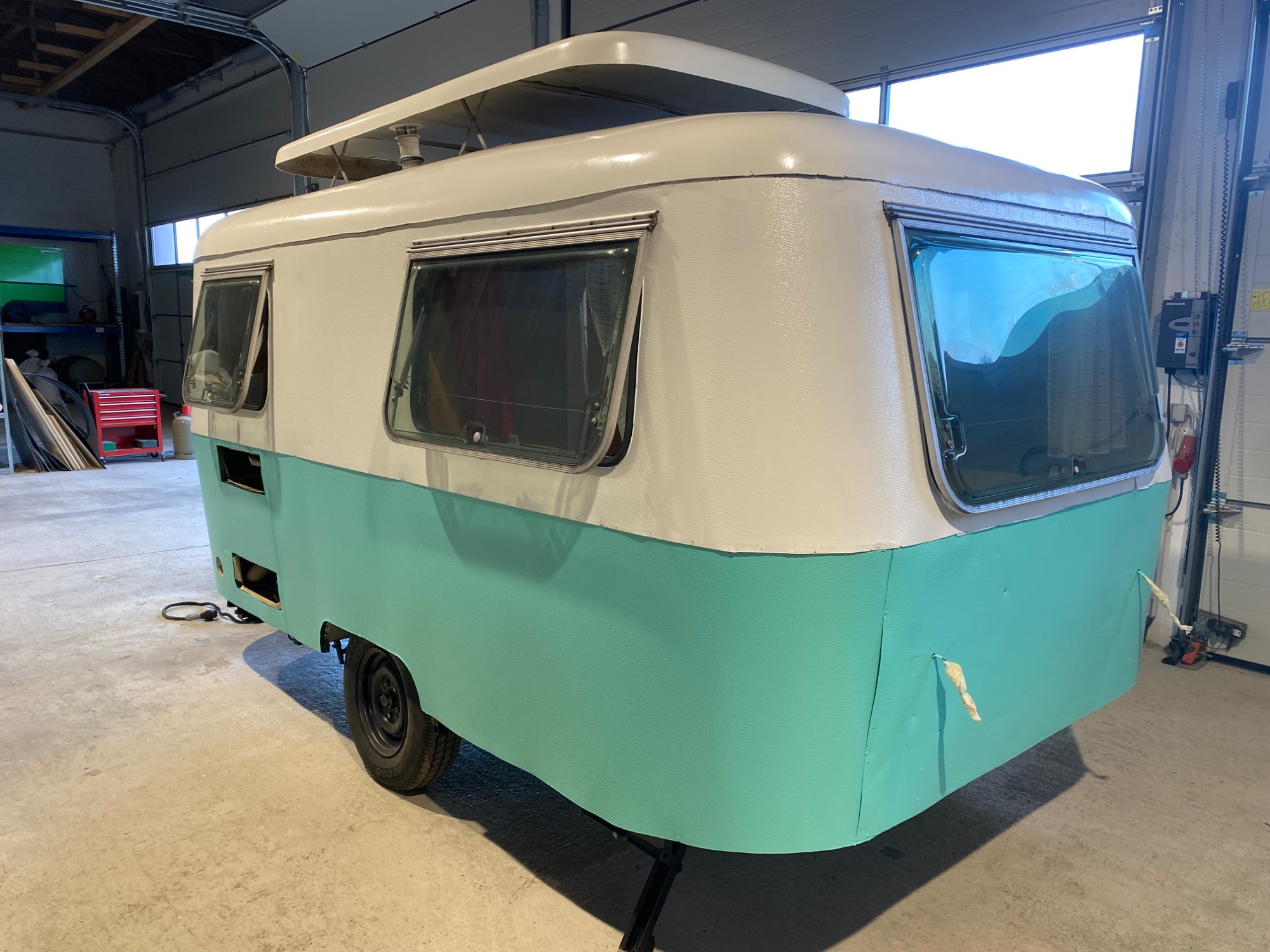 Konservierung Gitterrahmen von aussen und innen, Versiegelung Unterboden, Lackierung Deichsel, teilweise Erneuerung des Blechkleids, Neuabdichtung komplett, Lackierung zweifarbig komplett, neuer Hubdachstoff, Überarbeitung Elektrik 230V und 12V, Instandsetzung Wasseranlage, Batterieeinbau, Nachrüstung Doppelrollos, neue Reifen, Lackierung Felgen, Nachrüstung ASK, 100er-Zulassung, Tüv und Gasprüfung neu