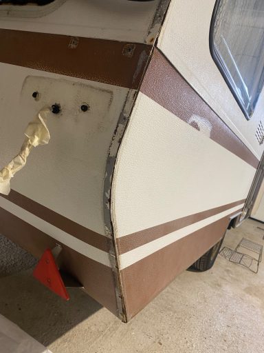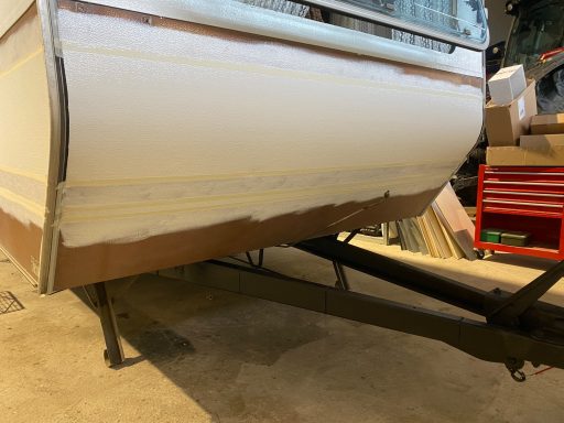 Neuabdichtung der Aluleisten und Kunststoffecken mit Dekaseal, Anfertigung einer neuen Blende vorne über der Deichsel, da alte GFK-Blende mehrfach gebrochen durch die Wippbewegungen.