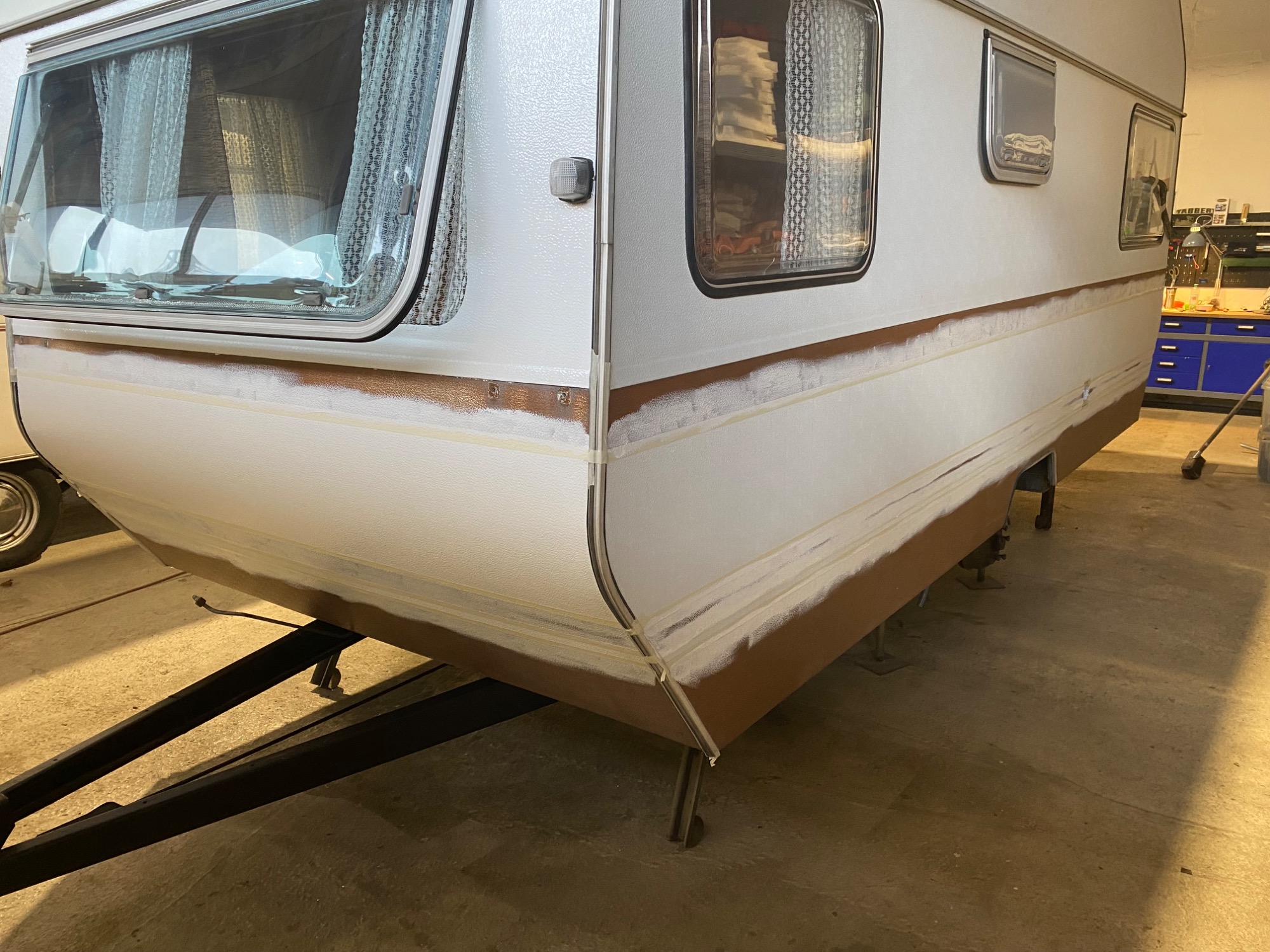 Neuabdichtung Kanten und seitliche Fenster, Reparatur Feuchtigkeitsschaden hinten links, Nachlackierung blauer Streifen, Aufbereitung und Reinigung Aufbau insgesamt, neues Dachfenster mit Abdichtung Rahmen, Gitter gegen Insekten um Kamin, Aufarbeitung Auflaufeinrichtung und Deichsel, neue Stossdämpfer ...